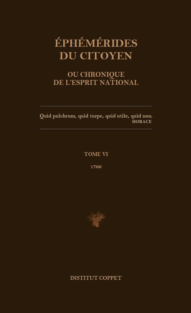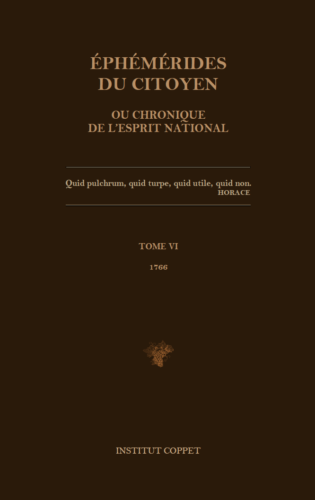 Fondé en 1765, les Éphémérides du Citoyen servit de réceptacle et de caisse de résonance au groupe des physiocrates. On y vit paraître certaines de leurs productions les plus emblématiques, telles que le Despotisme de la Chine de François Quesnay ou le petit traité de la Formation et de la distribution des richesses, par Turgot. Chacun des auteurs de la physiocratie — citons encore Baudeau, Mirabeau, Le Trosne — y ayant abondamment écrit, c’est une ressource de premier choix pour comprendre le libéralisme à la fois radical et humaniste que ces auteurs ont porté.