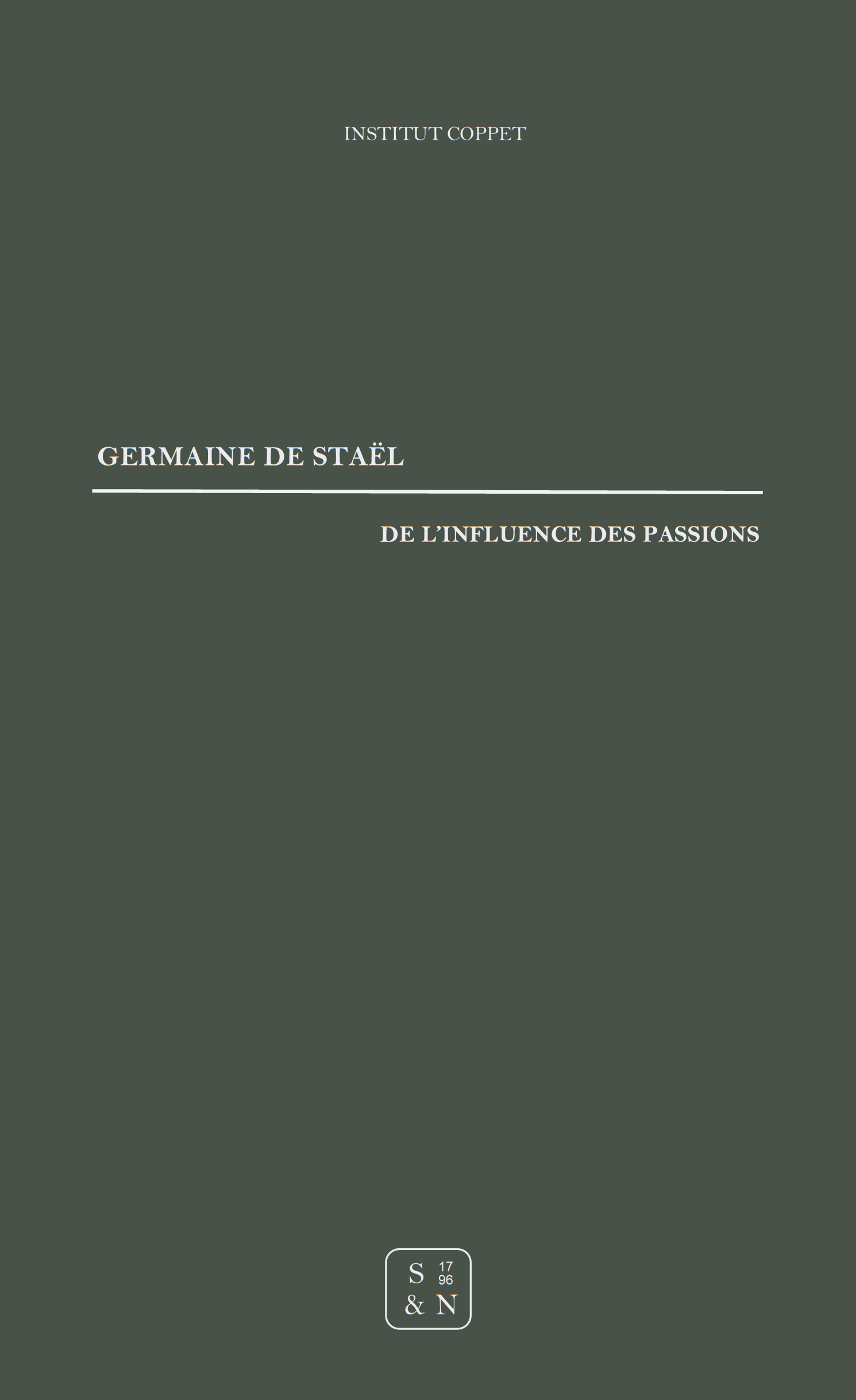 Dans De l’influence des passions sur le bonheur des individus et des nations (1796), Germaine de Staël demande qu’on cesse de considérer l’homme comme un être impassible, toujours maître de soi. Sans doute la liberté et l’épanouissement des individus s’obtiennent par l’usage de la raison ; mais les passions, qui tiennent aussi à notre nature, entravent la marche et nous guident sur une voie semée d’embuches. Il faut les examiner sérieusement, pour vivre en paix avec et malgré elles.